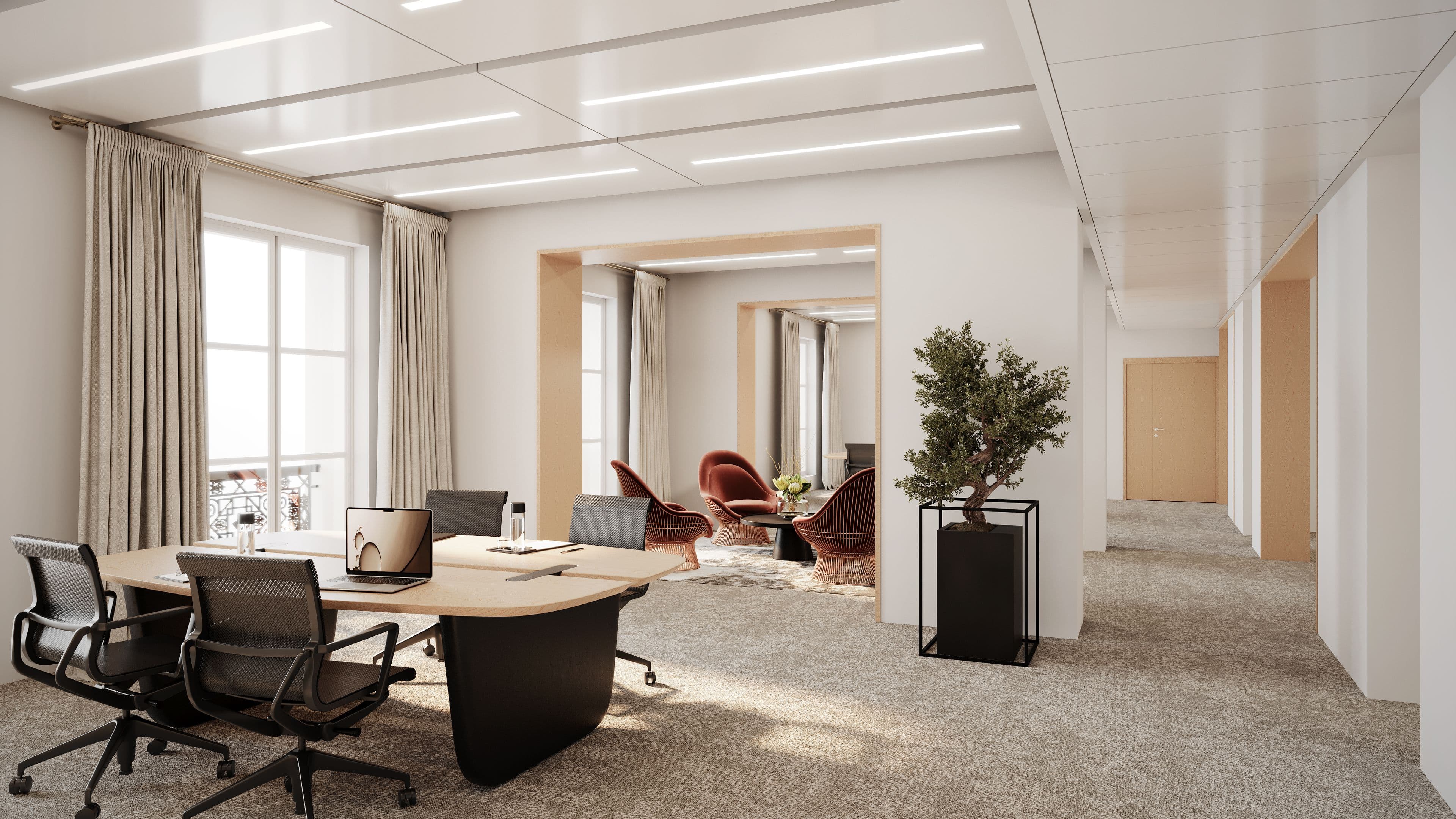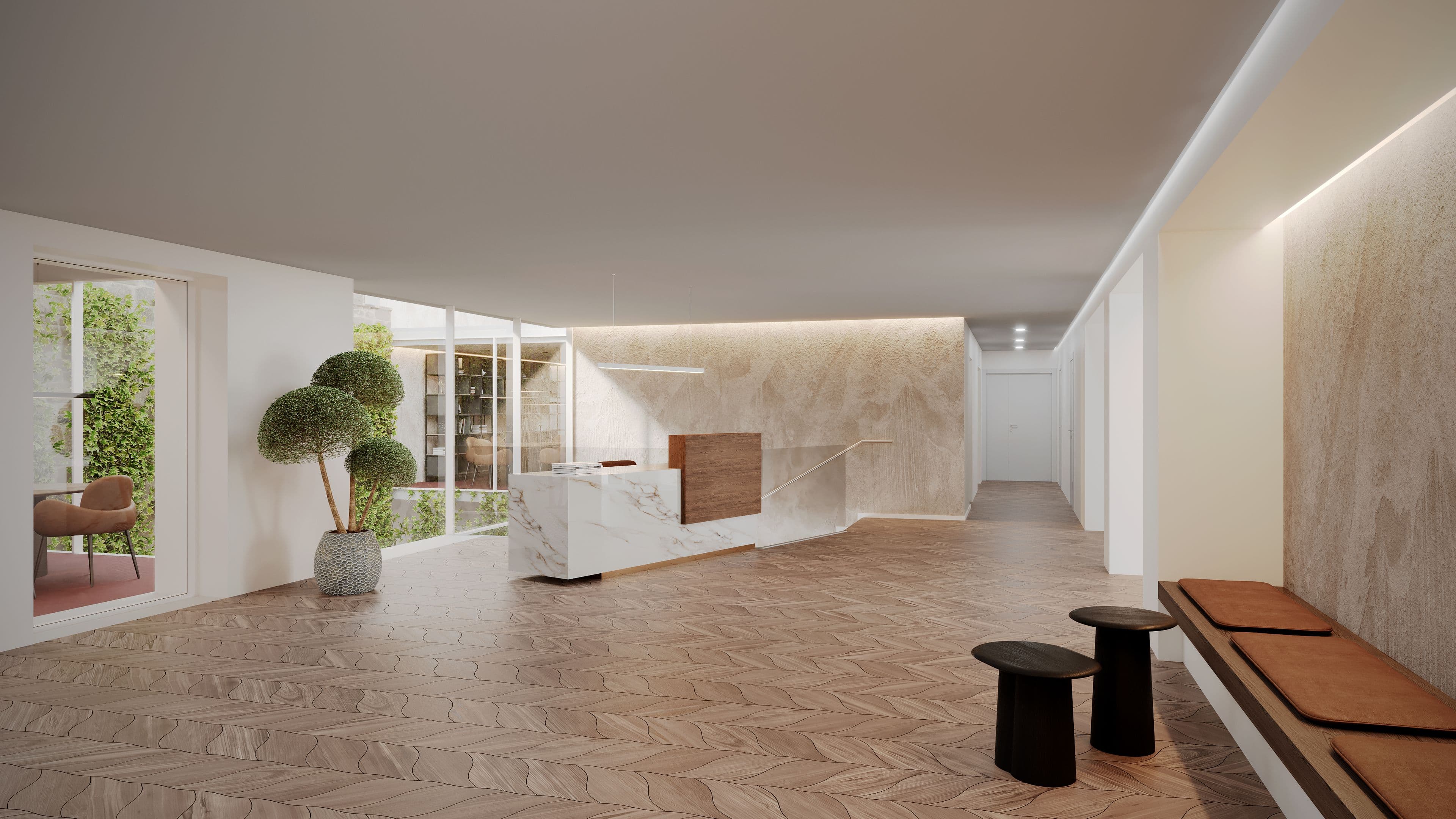 Ziel ist es, einen Single-Tenant für das Gebäude zu gewinnen. Im Erdgeschoss befinden sich Empfangs- und Wartebereiche sowie größere Besprechungsräume, die einen repräsentativen ersten Eindruck vermitteln. In der neu geschaffenen Gartenebene sind ein Auditorium mit Oberlicht, ein Work-Café sowie Duschräume geplant – Spaces, die Kommunikation und Zusammenarbeit fördern.