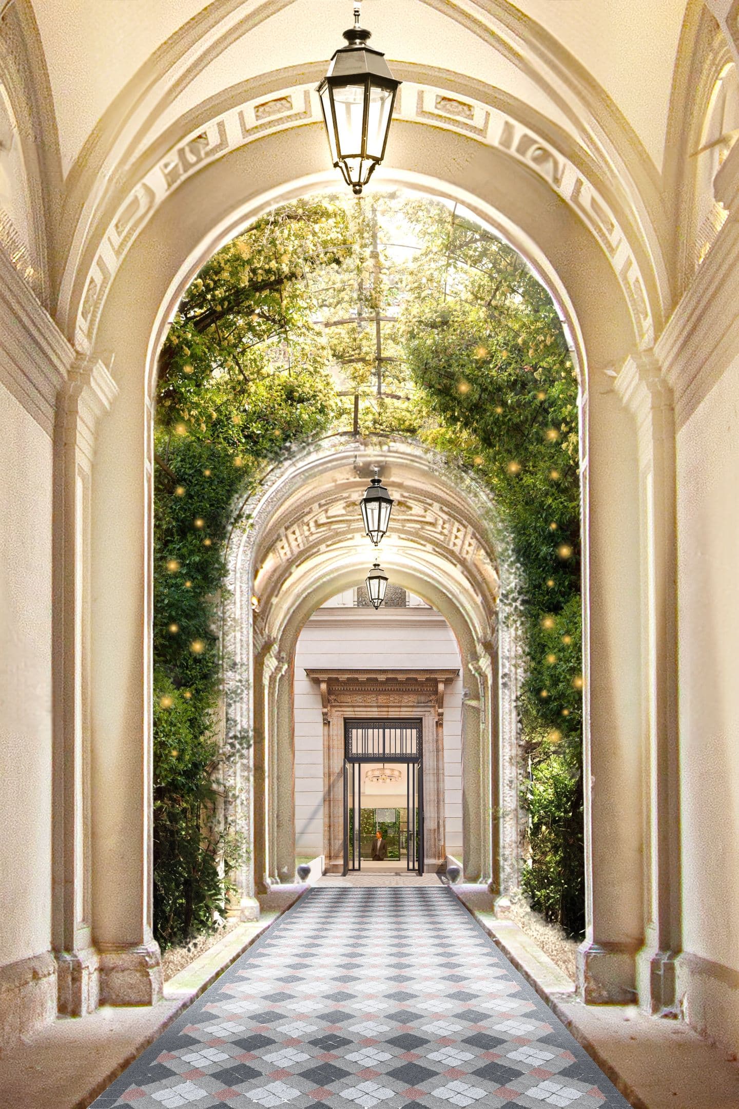 Erhalt und Aufwertung historischer Elemente: Die zwingende Erfüllung der Denkmalschutzauflagen wird als Chance begriffen – historische tragende Innenwände, Holzstützen und die charakteristische Fassade werden nicht nur erhalten, sondern gezielt in Szene gesetzt. Die Aufwertung der Sichtbarkeit erfolgt durch Renovierung der historischen Tor-Durchfahrt mit einem besonderen Licht-Konzept, das die Verbindungsachse von der Straße über Veranda und Innenhof bis zum Eingangsfoyer mit historischer Decken-Freske inszeniert.